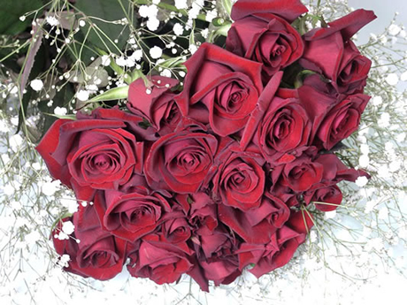 純白で可憐なカスミ草がバラの真紅の色を引き立てます。